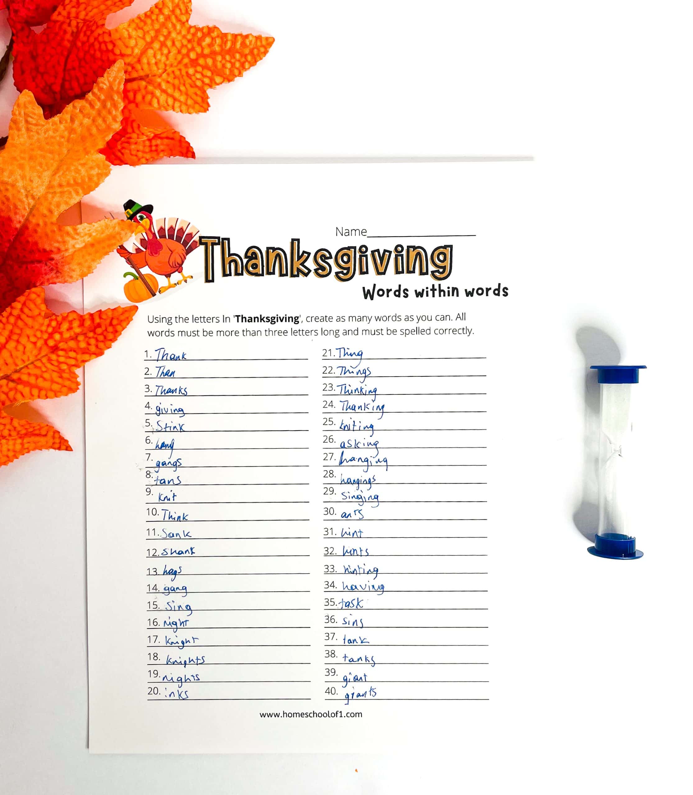 The โ€œwords within wordsโ€ game has become one of our favorites because it keeps kids busy for a long time. My son always tries to beat his previous score by finding as many words as possible hidden in โ€œThanksgiving.โ€ Itโ€™s a fantastic way to build spelling skills without feeling like schoolwork. We sometimes make it competitive, whoever finds the most words in ten minutes wins a prize. Itโ€™s simple, but surprisingly engaging.