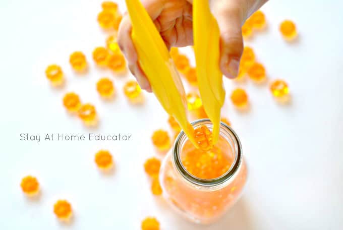 This clever activity builds the pincher grasp and hand-eye coordination in the most playful way. Kids “drop” small pumpkins, or pom-poms, into containers, turning coordination practice into a game. It’s a great sensory station idea, especially for preschool or occupational therapy-inspired play.
