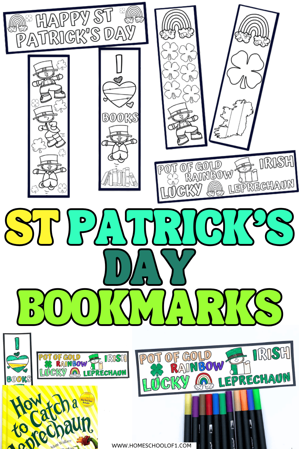 Printable St Patrickโ€™s Day bookmarks to color featuring leprechauns, shamrocks, rainbows, and fun phrases, with colored examples and markers shown below.